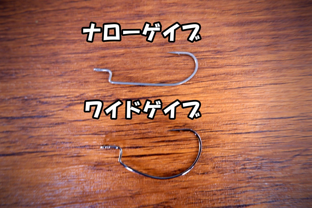ナローゲイブはゲイブの幅が狭いタイプで、扁平タイプのワームやストレートワームと相性が良いです。逆にバルキーで厚みのあるワームに装着するとフッキングに必要なゲイブ幅が確保されないので、フッキング率が落ちます。